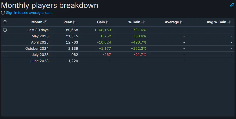 Los registros históricos muestran que el juego había alcanzado apenas 2.139 jugadores pico en octubre de 2024, tras meses de pérdida progresiva de interés. Incluso llegó a tener menos de mil jugadores activos en julio de 2023. Sin embargo, el relanzamiento —acompañado de mejoras en rendimiento y nuevos contenidos— logró multiplicar su base de usuarios por más de 80 veces.
