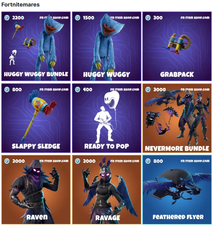 La sección principal está dedicada a Fortnitemares, con una selección de skins y conjuntos inspirados en lo macabro y lo fantástico. El Nevermore Fortnite Bundle encabeza la lista, incluyendo las legendarias skins Raven y Ravage, junto con el planeador Feathered Flyer (800 V-Bucks) y el pico Iron Beak.