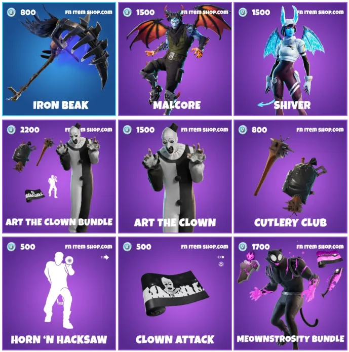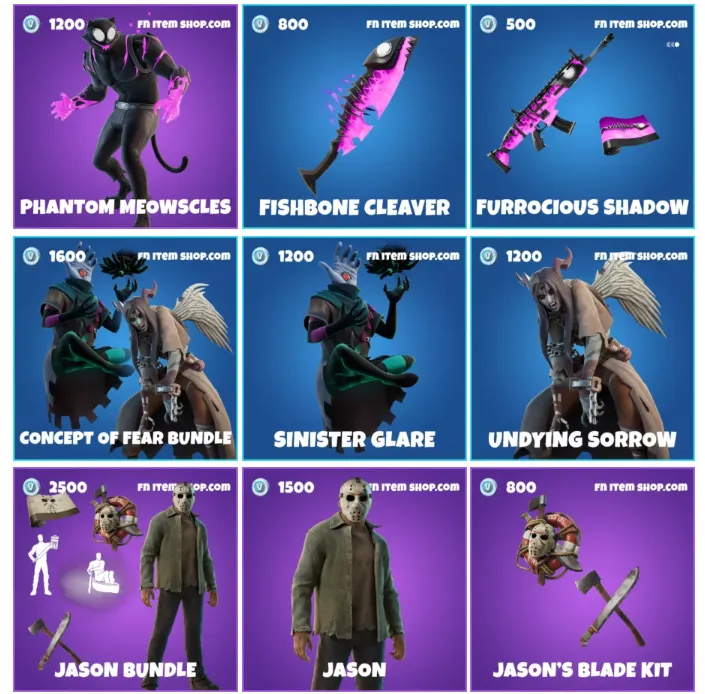 Fortnitemares domina la tienda con bundles como Nevermore, Meownstrosity y Concept of Fear.