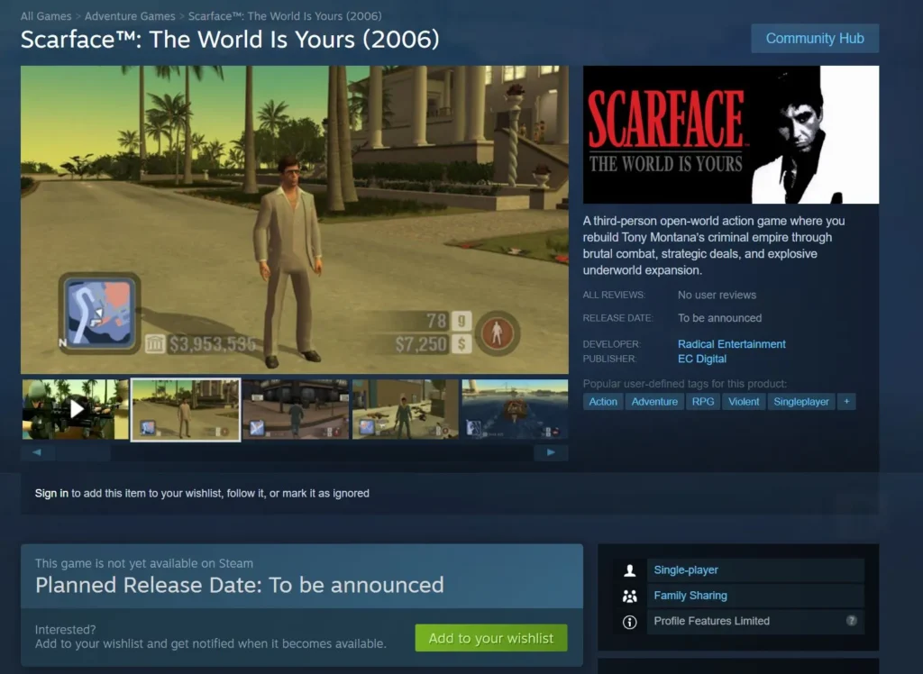 El legendario juego de acción inspirado en el clásico cinematográfico Scarface prepara su regreso triunfal. El estudio EC Digital, actual editor del título original lanzado en 2006, confirmó oficialmente que Scarface: The World Is Yours llegará pronto a Steam, marcando así su relanzamiento en PC tras casi dos décadas.