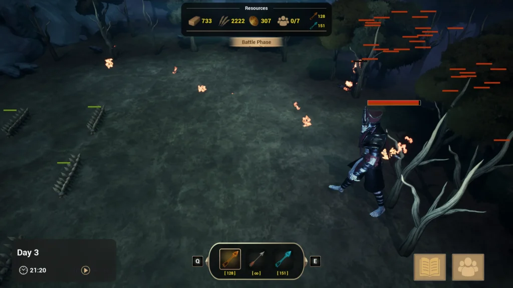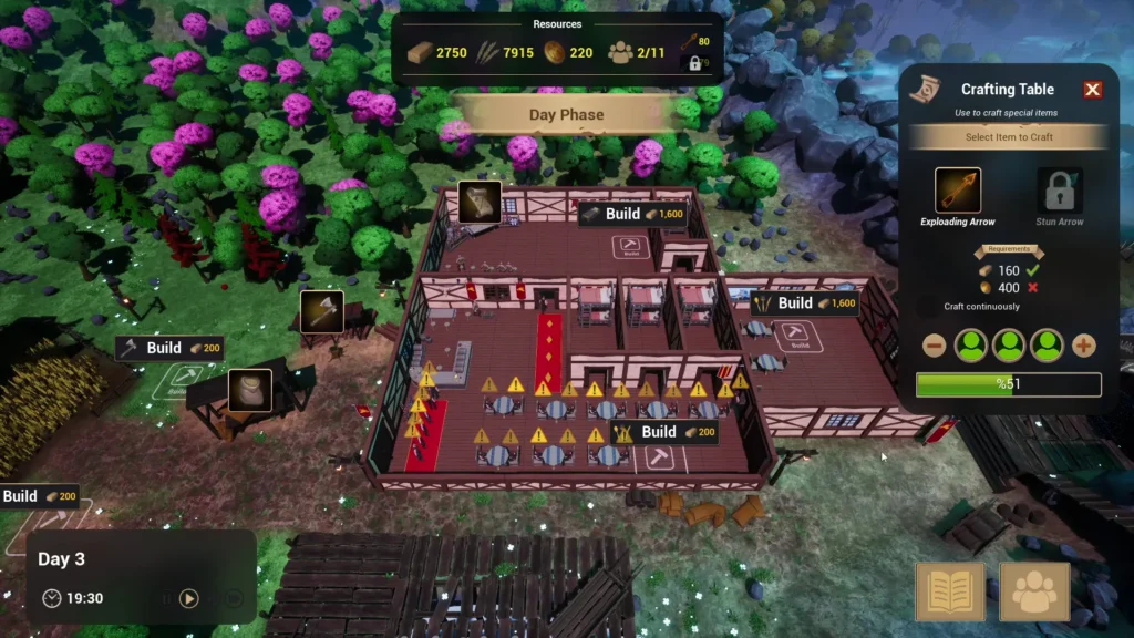 Durante las horas diurnas, el jugador debe contratar trabajadores, asignarlos a tareas específicas y maximizar la eficiencia de su posada. Podrás recolectar madera y alimentos, construir nuevas habitaciones, reparar defensas o preparar las murallas para la inminente invasión nocturna.