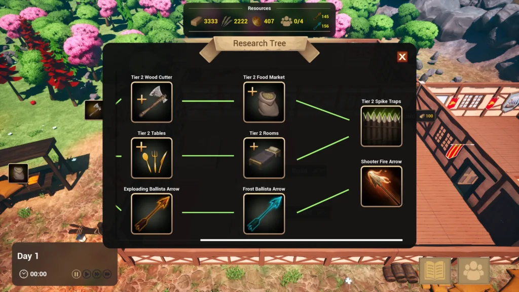 Tavernhold incorpora un árbol de investigación con mejoras tanto para la taberna como para las defensas. Las actualizaciones permiten aumentar los ingresos de las habitaciones, fortalecer a los trabajadores y trampas, y mejorar la ballesta con nuevas flechas. Cada avance es tangible, y el jugador siente un progreso constante mientras prepara su posada para enfrentamientos cada vez más complejos.