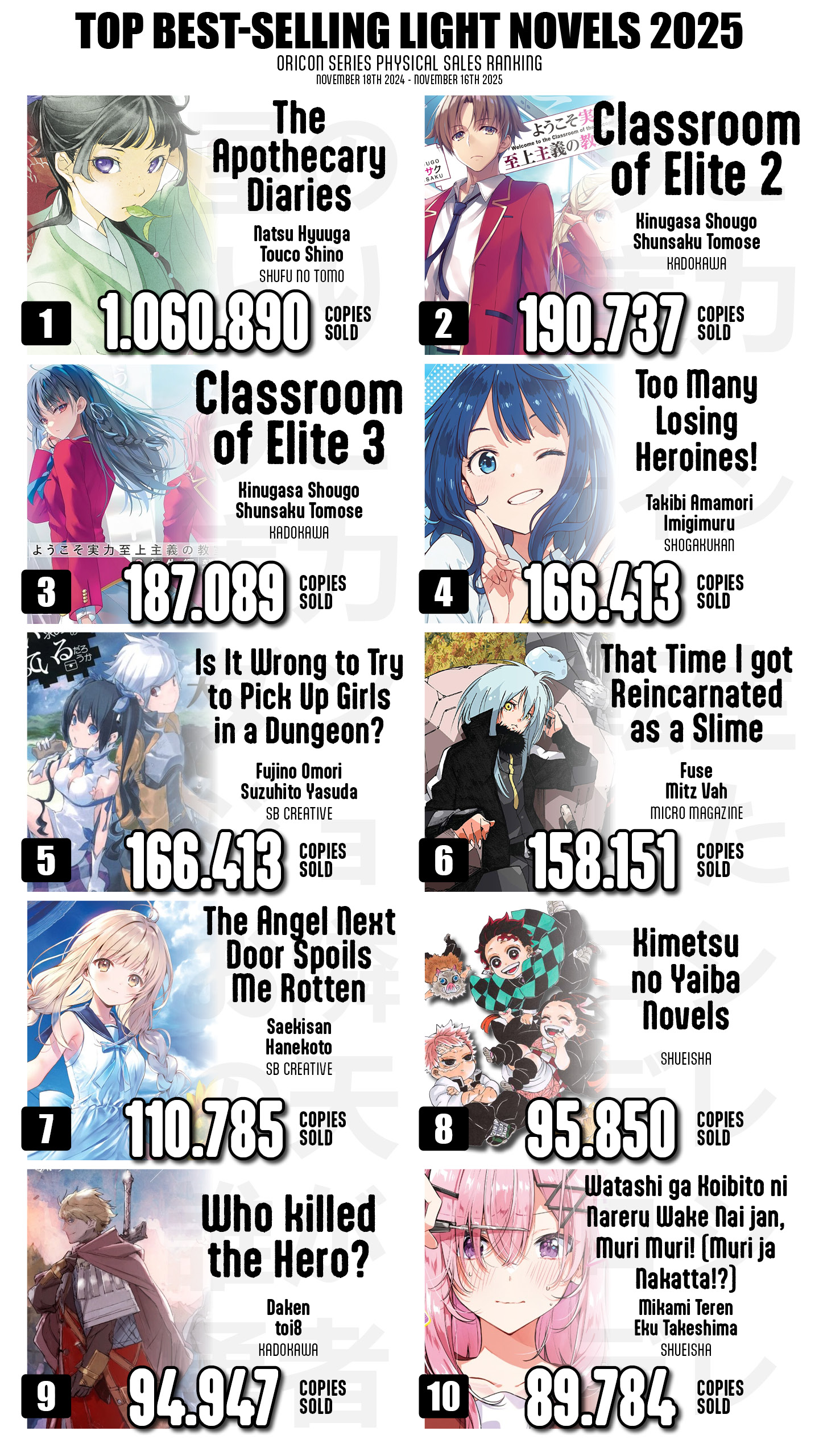 La distancia es tan grande que Classroom of the Elite —representada con sus series Year 2 y Year 3— no alcanzó ni la mitad de lo logrado por Maomao. Too Many Losing Heroines!, DanMachi y Tensei Slime, a pesar de sus bases de fans robustas, tampoco estuvieron cerca. La brecha no solo es amplia: es un abismo editorial.