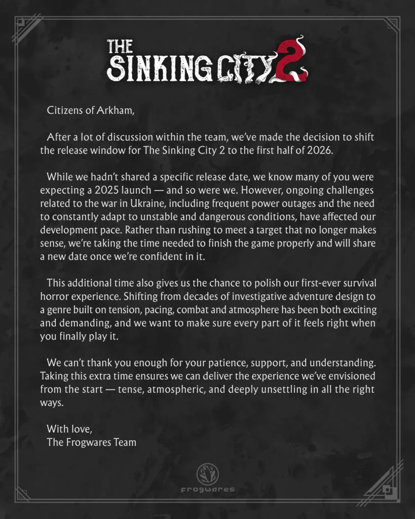El estudio ucraniano Frogwares confirmó oficialmente que The Sinking City 2 no verá la luz en 2025 como muchos esperaban. A través de un comunicado publicado en sus redes oficiales, el equipo explicó que el juego se retrasa hasta la primera mitad de 2026, tras una cuidadosa evaluación interna sobre el estado actual del desarrollo y los desafíos que enfrentan debido al contexto del país.