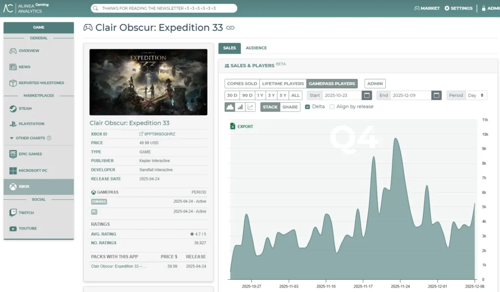 El problema es la proporción. Solo el 3% de las copias vendidas de Expedition 33 desde su nominación vinieron de Xbox. Por cada copia vendida en la plataforma de Microsoft, se vendieron 21 en Steam y 11 en PS5.