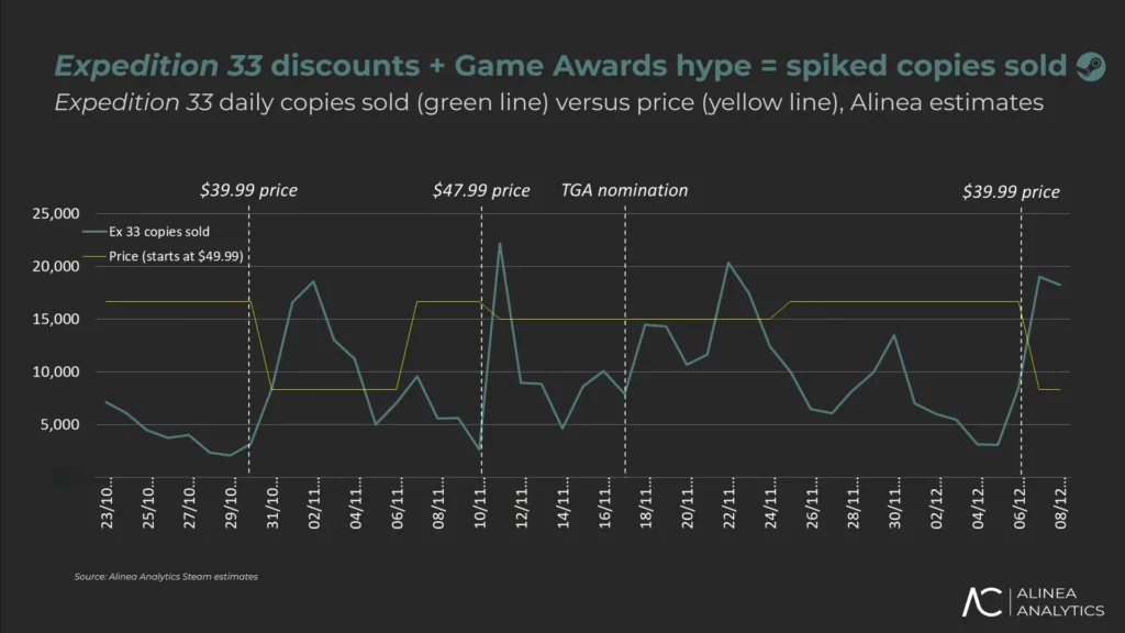 El caso de Expedition 33 ilustra cómo un ajuste mínimo puede cambiar el rumbo. Un descuento temprano a USD 39,99 impulsó picos de 19.000 copias en un día. Más tarde, un recorte sutil a USD 47,99 coincidió con el inicio del ciclo de hype de los TGA.
