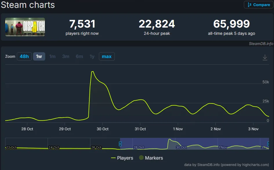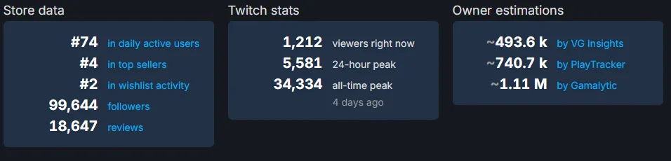 Las cifras impresionan: cuarto en ventas globales, segundo en listas de deseos, casi 66 mil jugadores simultáneos en su pico histórico. Lo normal sería pensar que se desinfla con el tiempo, pero no. El promedio diario ronda los 7.500 usuarios activos, una base firme para un juego que parecía, al principio, casi experimental.