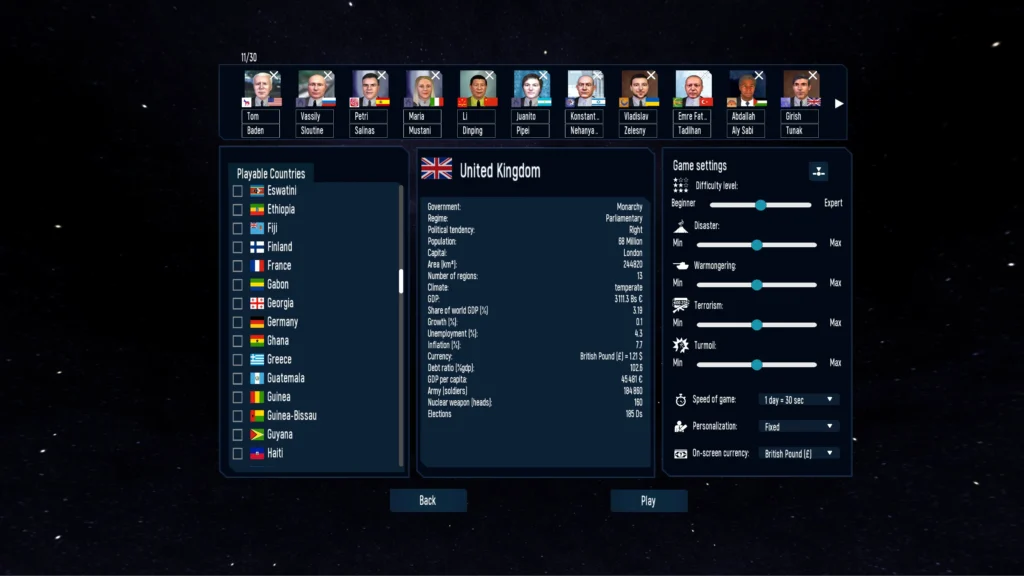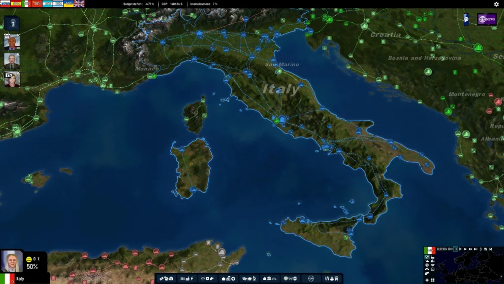El motor del juego procesa más de 600 indicadores por cada país de los 175 jugables, tomando en cuenta popularidad, comercio, alianzas, tensiones, movimientos sociales y variaciones económicas. Además, integra datos reales de más de 3.000 empresas globales, con miles más generadas procedimentalmente para representar todos los sectores del mercado mundial.