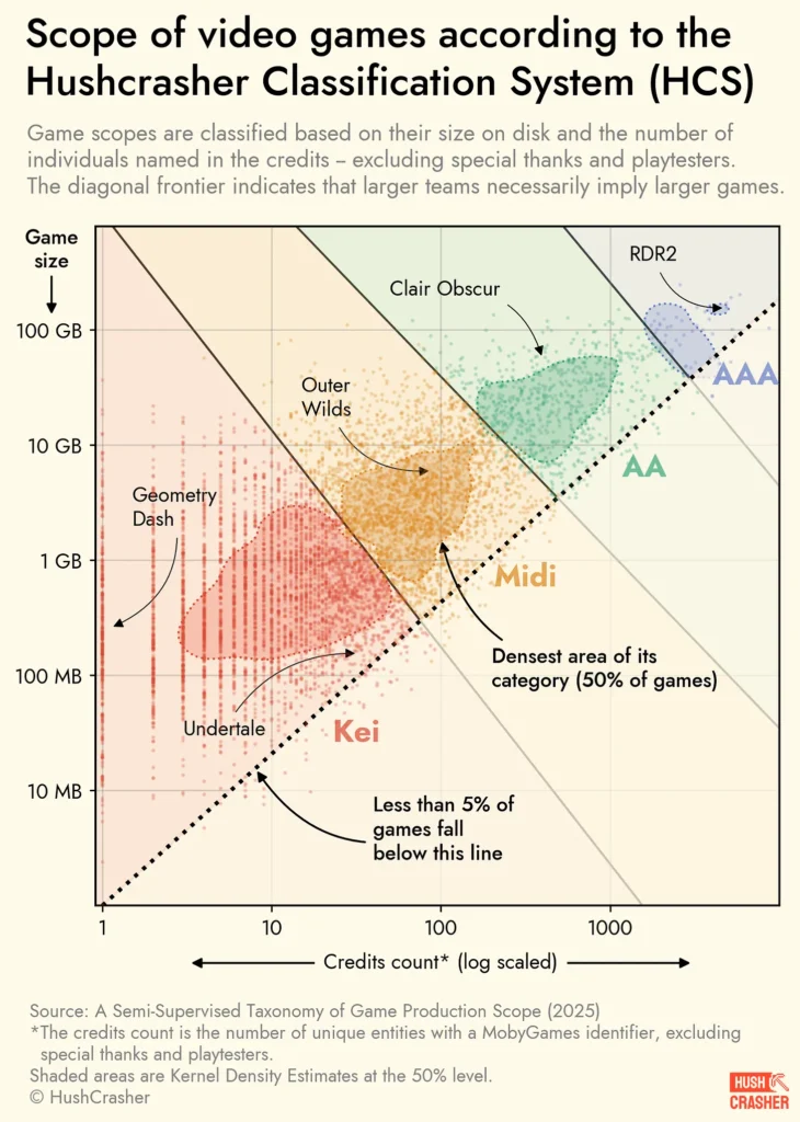 El estudio de análisis independiente HushCrasher presentó un innovador sistema de clasificación de videojuegos que busca reemplazar las categorías tradicionales como indie, AA y AAA, que suelen basarse en percepciones subjetivas. Su propuesta introduce cuatro categorías —Kei, Midi, AA y AAA— definidas a partir de métricas cuantitativas: el tamaño de instalación y la cantidad de personas acreditadas en el desarrollo.
